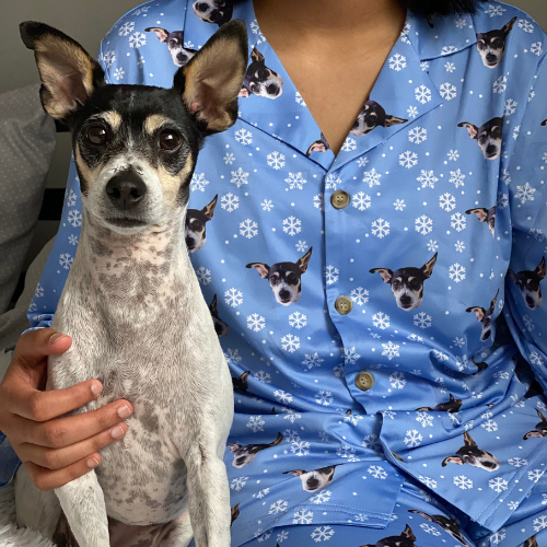 Our custom PJs feature your pet's face! They are lightweight so you can wear them in the summer, but cozy enough for the winter, as well.